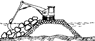 Ces blocs sont d'ordinaire déposés en deux couches au minimum, selon une pente généralement moins prononcée que celle du cur, à savoir 2,5/1 pour ce qui est de la pente externe et 1,5/1 pour ce qui est de la pente interne. Une pente de 2,5/1 signifie que chaque déplacement en avant de 2,5 m correspond à un accroissement de 1 m de la profondeur. La première couche de pierres peut être déposée par un excavateur hydraulique (figures 32b et 32c). Il est aussi possible d'utiliser une grue ordinaire s'il y a un espace suffisant pour les appuis latéraux. Il ne faut jamais utiliser une grue à pneus sur un cur mal nivelé sans avoir au préalable déployé ses appuis.