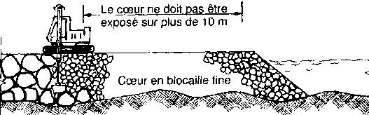 L'excavateur doit mettre en place le plus rapidement possible les pierres les plus grosses, de sorte que la blocaille du cur reste le moins possible exposée à l'action des vagues. En effet, si une tempête s'abattait sur le site avant que le cur n'ait été suffisamment protégé, la blocaille risquerait fort d'être entraînée par les vagues et dispersée sur l'ensemble de l'emplacement envisagé.