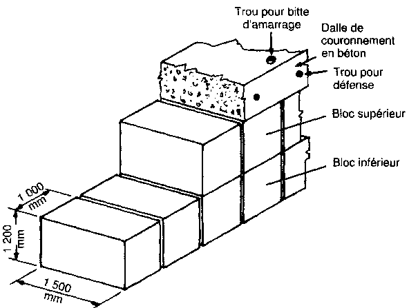 Quais. Il existe des quais pleins et des quais sur pieux. La figure 36 représente une coupe transversale type d'un quai plein, adapté aux endroits où le fond de la mer est rocheux ou sableux.