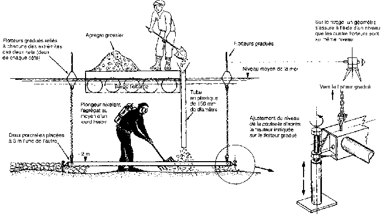 Cela a pour but d'empêcher les vagues d'arracher une pierre, ce qui aurait pour effet de faire basculer les pierres supérieures en bas du talus, de créer une brèche dans la couche de protection et d'exposer la blocaille plus fine sous-jacente. Pour que les pierres soient convenablement disposées, le nageur ou l'équipage du bateau doivent donner des indications à l'opérateur de la grue chaque fois qu'une pierre est mise en place jusqu'à ce que la couche émerge. Comme dans le cas de la sous-couche, la couche de protection principale doit être constituée de deux couches de pierres. Pour établir le profil du talus, on procède tous les 5 m à la même opération que celle décrite à la figure 32.