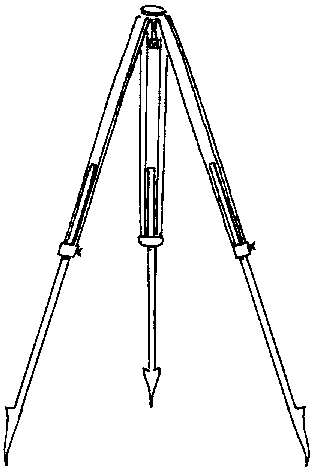 Le trépied (figure 7) sert simplement de support au théodolite ou au niveau. On utilise généralement un seul trépied pour ces deux instruments. Lorsqu'on emprunte un théodolite ou un niveau, il faut s'assurer que le boulon de fixation du trépied s'adapte bien aux deux instruments, car certaines marques ne sont pas interchangeables; par exemple, on peut y fixer le théodolite, mais pas le niveau. Dans ce cas, il faut se procurer un trépied pour chaque instrument.