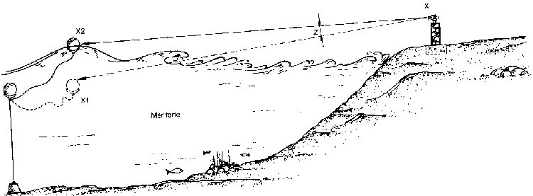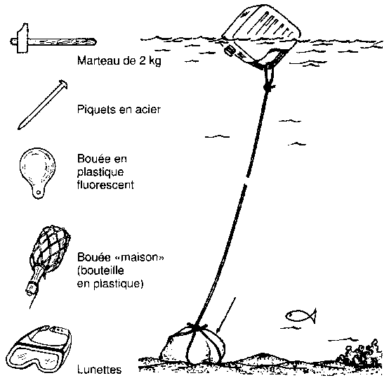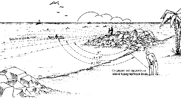 La ligne à flotteurs doit être installée ou mise à flot entre deux points, à savoir un piquet planté sur le rivage et une bouée flottant au large (figure 18). La position du piquet planté dans le sol est facile à déterminer et doit être rapportée à la carte topographique du rivage proche de l'abri envisagé.