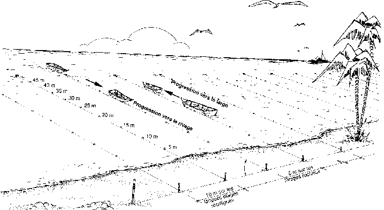 Ainsi, le bateau A de la figure 18 est dépourvu de point de référence par rapport à la côte. Le bateau B, par contre, utilise une ligne à flotteurs étalonnée (figure 14) pour déterminer sa position par rapport au rivage (dans ce cas, 20 m sur la ligne droite joignant le piquet et la bouée).