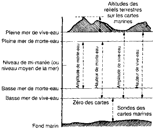 Pour que les navires puissent naviguer en toute sécurité dans les ports aménagés par l'homme, toutes les profondeurs sondées sont rapportées au zéro des cartes ou au niveau de basse mer de vive-eau, et les hauteurs terrestres au niveau de pleine mer de vive-eau.