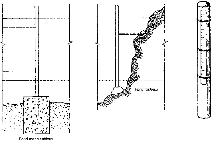 Pour établir un annuaire des marées propre à une zone ou à un village côtier particulier, on n'a besoin que d'une simple échelle de marée installée dans un endroit relativement calme. Cette échelle de marée (également appelée «marégraphe>) peut être facilement fabriquée à l'aide d'un tube en acier ou en plastique, ou d'une perche, sur lequel on fixe un morceau de ruban à mesurer en plastique; un mètre de couturière fait parfaitement l'affaire (figure 22b).