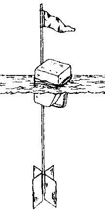 La force d'un courant peut être mesurée en chronométrant le temps qu'il met pour parcourir une distance connue le long de la côte ou pour traverser une baie. On peut se servir d'un simple flotteur constitué d'un bidon lesté par un contrepoids placé à environ 1 m au-dessous de la surface de l'eau (figure 24) en vue de mesurer la force d'un courant. Lorsqu'on mesure des courants en mer, il faut prêter attention aux points suivants: