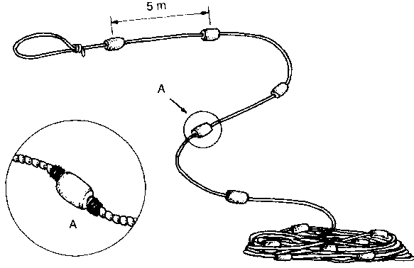 Une ligne à flotteurs (figure 14) consiste en une corde en polypropylène de 6 mm de diamètre munie de petits flotteurs rouges en liège espacés de 5 m et de flotteurs de couleurs différentes espacés de 10, 20 ou 50 m. Elle sert à mesurer les distances en mer à partir d'un point fixe du rivage. Habituellement, ces lignes mesurent environ 200 m de long et sont enroulées sur un tambour ou dans un panier de pêche rond.