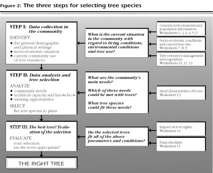 The manual attempts to provide a clear explanation of the process of identification of appropriate trees species. To assist this process the manual also includes worksheets that can be used by the field worker for collecting and analyzing information from both secondary sources (government documents, project reports, etc. - see Appendix 3) and the community.
