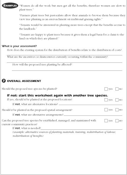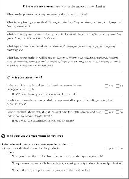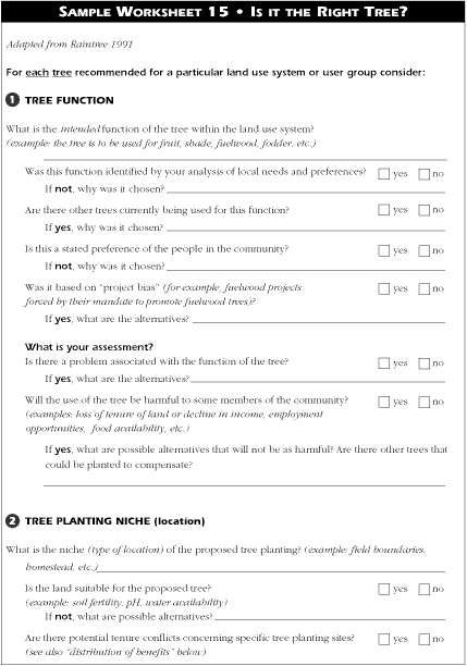 This is a checklist of factors that should be considered when tree species are being selected. When a possible tree species has been identified, sit down with community members (women, men, leaders, other groups; together or separately) and go through the checklist to be certain that the following important factors have not been overlooked.
