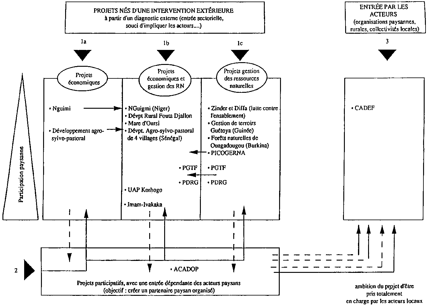 - la première catégorie (1)Elle regroupe des projets définis au départ à partir d'un diagnostic externe. Leur entrée initiale a pu être sectorielle avec des projets économiques (1-a) ou des projets de gestion ressources naturelles (1-c).