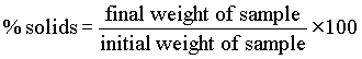 The method involved is the same as that described for moisture content above, but the result is expressed as ' % solids'. This is calculated using the following formula: