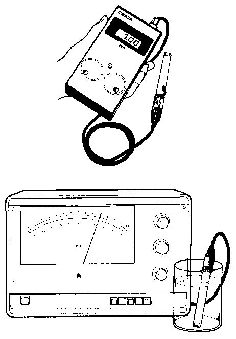 If greater accuracy is required a pH meter should be used. These may be mains powered bench models or battery powered portable models (Figure 44: Bench mounted and portable pH meters). In general bench models are more accurate than portable types, although newer equipment has reduced this difference. Bench types are more expensive than portable types and, when properly maintained, may have a longer working life. If voltage fluctuations are a problem, bench models require a voltage regulator to be fitted.