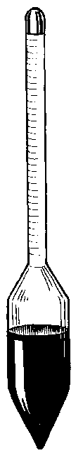 Hydrometers are hollow glass rods with a bulb at one end (Figure 45: Hydrometer for measuring salt concentration in brine). They are sealed at both ends so that they float when immersed in a liquid. The bulb is weighted so that the hydrometer partially sinks to a level that depends on the specific gravity of the brine (the more salt that there is in a solution, the higher the specific gravity). A scale on the stem of the hydrometer is calibrated and may read from 0-100 degrees, where 0 is pure water and 100 is saturated salt solution (26.5%). It is important that the measurements are made at the reference temperature for the hydrometer (usually 20°C) because the specific gravity of the brine changes at different temperatures.
