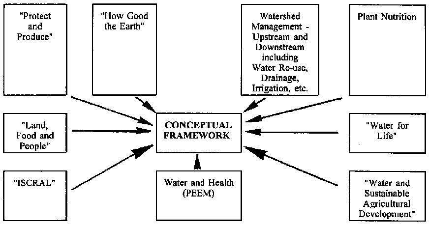 All work in education, extension and manuals should be developed around a central concept. A very good start for the development of a suitable central framework was provided by Dr. Falkenmark's introduction. The way in which this framework could be developed fully to incorporate soil, water and plant nutrients management is illustrated in Figure 1.