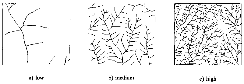 The dominant slope is the most important differentiating criterion for the major landforms, followed by relief intensity. Landforms are further described by their regional slope, hypsometry and the degree of dissection. SOTER uses the drainage density as a qualitative measure of the degree of dissection. The drainage density is defined as the total length of drainage channels per unit area of land, expressed as km x km-2. Three classes are defined as illustrated in Figure 3.