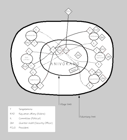 The territory of Anivorano comprises about 18 km2 of land covering several steep hill slopes (see diagram 2: Transect walk). The boundaries of the territory follow the top ridges of the mountains at the periphery. By ancestral rules, all the land in the territory belongs to Anivorano except one communal area shared with Ambodigavo, a neighbouring village whose population belongs to the same lineage. Each of the villages must have the permission of the other before exploiting land in this shared area.