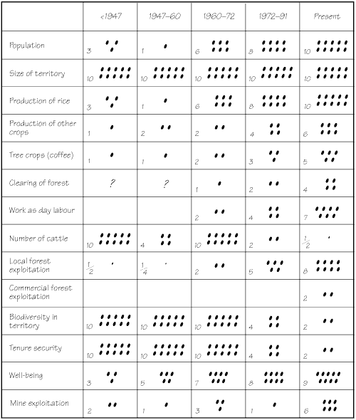 There is no doubt that qualitative measures of this kind have their limits. Although for the purpose of this study, knowing that rice yields decline from a relative factor of 10 down to 1 over a 50-year period was sufficient and highly illuminating, someone who goes on to study the tavy rice system and what might be done to improve it will find these numbers of little use. Such a study would undoubtedly need much more precise figures on the decline in yields and precise measurements of the yields from various fields for comparison. In this case, precise quantification would be important because more detailed information would permit a more complete analysis of how and why yields change over time.