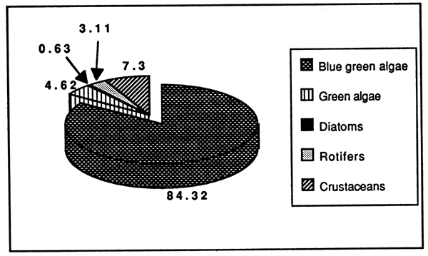 The mean standing crop of plankton is estimated at 10.8 ml m-3 within a range of 6.4 to 26.5 ml m-3 (observation period 1983 to 1986). The characteristic feature of the reservoir is the Microcystis sp., blooms during low water levels. The blue-green constitute 84.32% of the total plankton of the reservoir (Fig. 2.7).