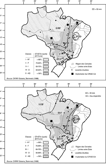 Les régions d'élection de la culture de riz pluvial sont les écologies à faible risque climatique. Steinmetz, Reyniers et Forest (1988) ont établi un indice de productivité espérée (IPE) égal au produit de la productivité potentielle du cultivar (IVAR) par le plus petit indice de satisfaction des nécessités en eau de la plante durant la période la plus critique (ETr/ETm).PC; IPE = IVAR x ETr (cycle) x ETr/ ETm (PC). En fonction de l'indice de satisfaction des besoins en eau, Steinmetz, Reyniers et Forest ont cartographié les aptitudes à la riziculture pluviale du territoire brésilien en cinq grandes régions agroclimatiques: hautement favorisées (HF), favorisées (F), intermédiaires (I), défavorisées (D) et hautement défavorisées (HD) (figure 1). En prenant comme réserve d'eau utile dans le sol 50 mm et 90 mm, les cartes montrent que les régions pédoclimatiques les plus favorables à la riziculture pluviale - lorsque la réserve en eau utile est la plus faible - sont situées dans les régions à forte pluviométrie des Etats de l'ouest, du nord et du nord-ouest, qui correspondent grosso modo aux savanes et forêts humides du bassin amazonien et à son pourtour immédiat.