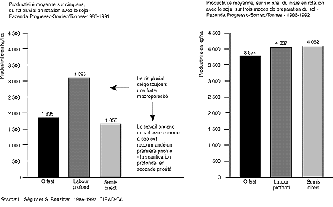 The cropping systems with the best reproduction performances have been developed using annual crop successions with two crops per agricultural year. These employ soybeans and upland rice as the main crop, followed by sorghum or millet. Soil management maximizes the use of direct drilling (zero tillage), which is the only management technique giving both total protection of the environment and an optimal utilization of crop-soil biological activity at a lower cost.