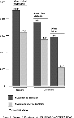 Les principaux résultats, figurant dans la figure 8, montrent que ces itinéraires riz pluvial avec semis direct sur sol protégé sont nettement plus productifs que les mêmes itinéraires pratiqués à l'offset sur sol nu, à condition que les légumineuses qui précèdent le semis direct du riz (genres Sesbania et Crotalaria) soient desséchées et laissées sur pied au moment du semis; le gain de productivité avec cet itinéraire par rapport à celui réalisé à l'offset en sol nu est supérieur à 45 pour cent.