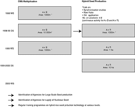 To introduce the technology in the shortest time possible, emphasis is given to the applied aspects that are well focused and goal-oriented. In the technical programme, building up the capacity large-scale seed production within the country in a short time is very important for introducing this technology. Initially, the hybrid combinations need not be developed indigenously. The hybrids primarily developed by IRRI, but also by other countries, that have been found to perform well in some of the Asian countries could be evaluated (Box). Schematic diagrams outlining the research network to be formed for implementation of the project and the processes of evaluation and seed production are given in Figures 1-3, respectively. Only the broad outlines are presented here; the finer details need to be worked out in accordance with the needs and conditions of the different countries. The outline given envisages the start of the evaluation process during the 1998 wet season and the possible release of a hybrid for commercial cultivation by the wet season of 2001, i.e. within three years the technology could be introduced in some other Asian countries, provided it is technically and economically feasible and all other requisite facilities, human resource development and seed production mechanisms are in place.