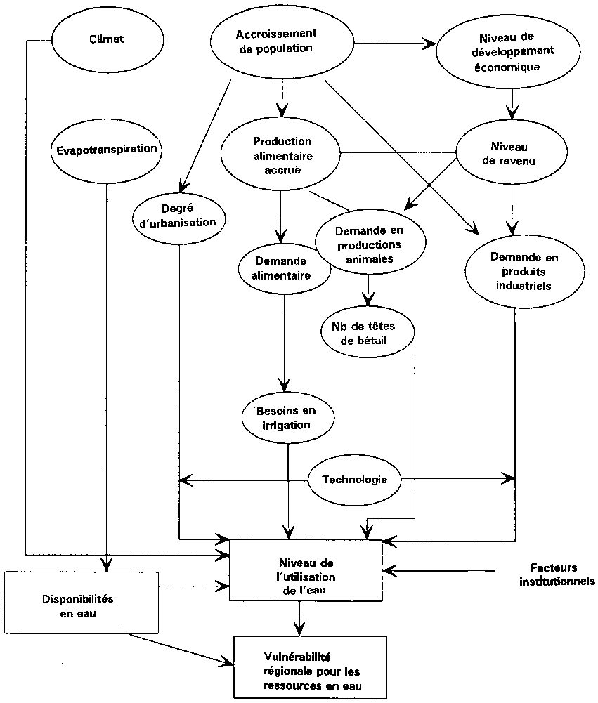 Les principaux facteurs affectant les disponibilités et la demande en eau sont représentés dans le diagramme 1 (Kulshreshtha, 1993).