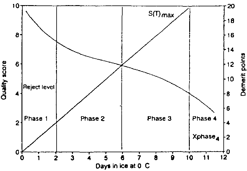 There is a linear correlation between the sensory quality expressed as a demerit score and storage life on ice, which makes it possible to predict remaining storage life on ice. The theoretical demerit curve has a fixed point at (0,0) and its maximum has to be fixed as the point where the fish has been rejected by sensory evaluation of, e.g., the cooked product (see under structured scaling) or otherwise determined as the maximum keeping time. Using cooked evaluation the two parallel sensory tests demand an experienced sensory panel even though this is only required while developing the scheme, and later on it will not be necessary to assess cooked fish in order to predict the remaining shelf life. QIM does not follow the traditionally accepted S-curve pattern for deterioration of chilled fish during storage (Figure 5.1). The aim is a straight line which makes it possible to distiguish between fish at the start of the plateau phase and fish near the end of the plateau phase (Figure 8.2).