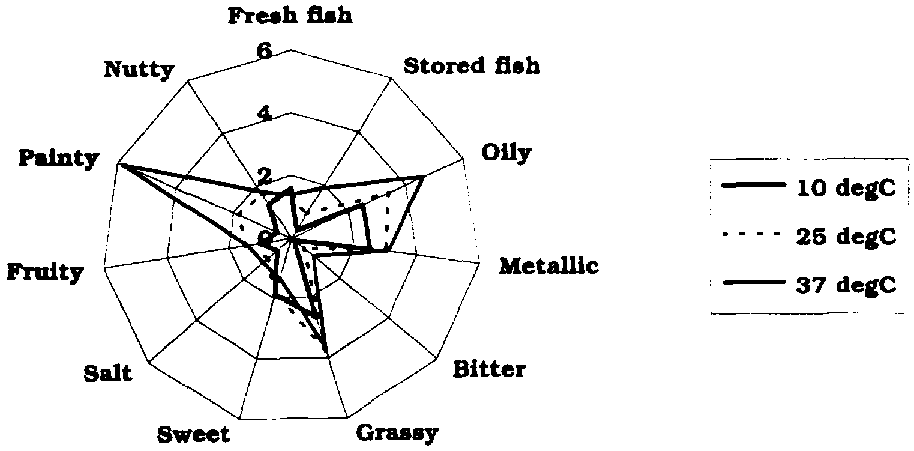 Advanced multivariate analysis is used for statistics and makes it possible to correlate single attributes to oxidative deterioration in the fish oil. The results can be reported in a "spider's web" (se Figure 8.5). The panel uses an intensity scale normally ranging from 0 to 9.