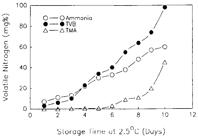 Ammonia has been found to be an excellent indicator of squid quality (LeBlanc and Gill, 1984) and comprised a major proportion of the TVB value for chilled short-finned squid (Figure 8.7). However, ammonia would appear to be a much better predictor of the latter changes in quality insofar as finfish are concerned. LeBlanc (1987) found that for iced cod, the ammonia levels did not increase substantially until the sixteenth day of storage. It would appear that at least for herring, the ammonia levels increase far more quickly than trimethylamine (TMA) levels which have traditionally been used to reflect the growth of spoilage bacteria on lean demersal fish species. Thus ammonia has potential as an objective quality indicator for fish which degrades autolytically rather than primarily through bacterial spoilage.