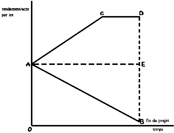 Encadré 1.2. Exempte 1. Projet de protection du sol Supposons qu'une parcelle donnée soit soumise à une érosion assez rapide et continue qui réduit la production agricole. Un projet forestier de conservation a été proposé pour mettre un terme â l'érosion et redonner â la terre un niveau de productivité plus élevé (du niveau A d'aujourd'hui au niveau CD ultérieurement). La situation est présentée ci-dessous: Si nous n'appliquions pas le principe avec et sans, nous risquerions de limiter les avantages du projet à la surface ACDE. En réalité, sans le projet, l'érosion et la perte du sol ne resteraient pas constantes au niveau de la ligne AE, mais se poursuivraient le long de la ligne AB. En appliquant le principe avec et sans, nous voyons que les avantages réels dus au projet correspondent â la surface ACDB.