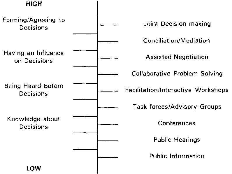 Figure 4 illustrates various levels of involvement with examples of participation techniques appropriate to each level. The lower levels of participation are characterized by traditional public information programmes and public hearings. These are typically techniques that emphasize one-way communication. Moving up, techniques such as task forces, workshops that may involve a neutral person to keep them focused (a facilitator) and collaborative problem solving are emphasized. Typically these are techniques that emphasize two-way communication and often use the neutral assistance of facilitators to help shape the process, but not the substance, of dialogue. The high end of the scale includes structured techniques designed to produce consensus, agreement, or resolution, such as conciliation, mediation, and arbitration.