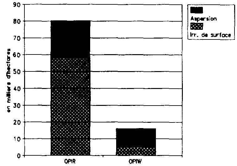 De la surface totale équipée des OPIR et des OPIW considérée comme irrigable, soit 96 300 ha, 62 560 ha (ou 65%) sont irrigués par irrigation de surface et 33 740 ha (ou 35% par aspersion (figure 5).