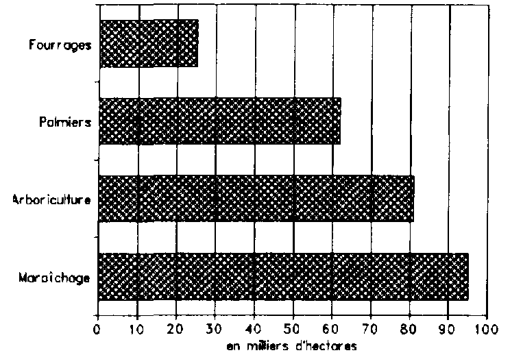 L'arboriculture fruitière dans les grands périmètres irrigués (OPIR et OPIW) occupe près de 31 000 ha, soit 17% des surfaces équipées pour l'irrigation dans les grands périmètres, mais 74% des superficies réellement irriguées dans les grands périmètres en 1991. Les cultures arboricoles sont en effet prioritaires lors de la distribution de l'eau. Aussi, pour pallier les fréquents arrêts de distribution de l'eau, en particulier dans le cas de cultures maraîchères qui ne reçoivent l'eau qu'après les cultures arboricoles, de nombreux agriculteurs ont creusé des puits au sein même des périmètres.