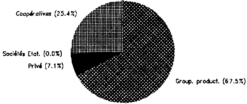 Les principales cultures irriguées sur les périmètres en maîtrise totale/partielle sont le riz le maraîchage et l'ananas (figure 8). Les différentes structures de gestion des périmètres irrigués sont les groupements de producteurs, les sociétés d'Etat, les coopératives et les sociétés privées: seuls les périmètres gérés par les groupements de producteurs restent irrigués (figures 9 et 10). Le coût moyen de réhabilitation des grands périmètres était évalué avant la dévaluation du FCFA à 9 000 $EU/ha, et le coût moyen de création d'un petit périmètre était évalué à 3 000 $EU/ha à la même époque.