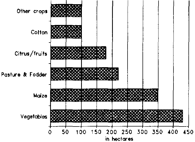 Total irrigation potential has been estimated at 39 300 ha, but, taking into account the water availability, it drops to about 20 000 ha, including flood recession cropping. The Total water managed area is 7 881 ha, or 39% of the irrigation potential. Full or partial water control is provided on 1 381 ha, which is only 17% of the total water managed area. Of this, 612 ha (44%) is irrigated from groundwater and 769 ha (56%) from surface water, either by pumping from the Limpopo and other rivers or from storage reservoirs (Figure 2). The major irrigated crops are vegetables, maize, pasture and fodder crops, citrus and cotton (Figure 3). There are some 6 500 ha of flood recession cropping - molapo - around the Okavango and Chobe enclave, on which mostly maize and millet are planted (Figure 4).