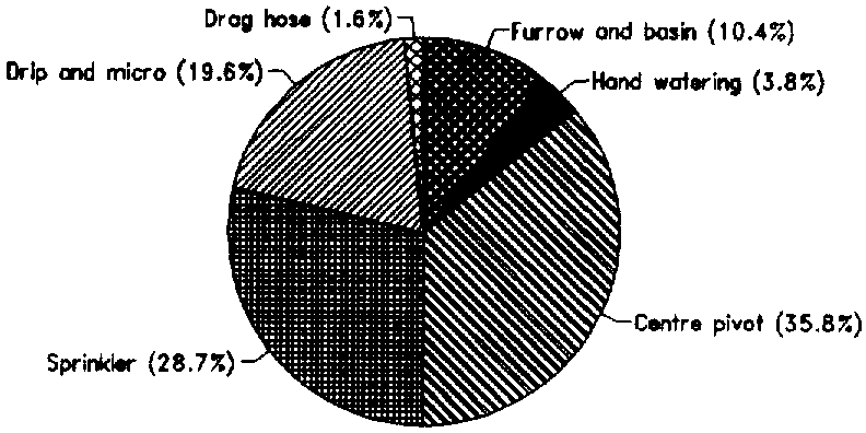 Full and partial control irrigation techniques include 218 ha surface irrigation (53 ha hand watering; 143 ha furrow and basin; and 22 ha drag hose) and 1 163 ha under overhead irrigation (495 ha centre pivot; 397 ha sprinkler; and 271 ha under drip and micro-sprinkler) (Figure 5).