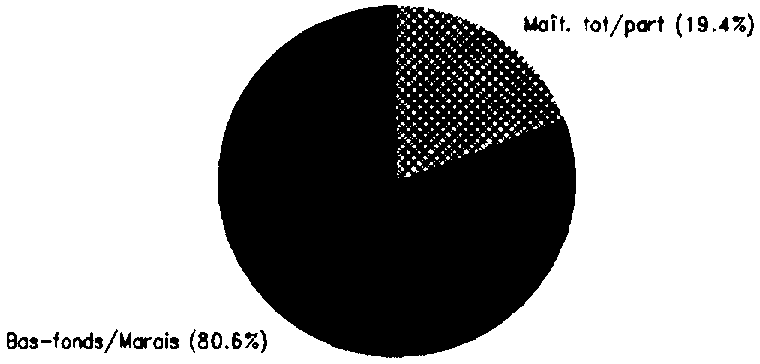 La superficie de marais et des bas-fonds cultivés est estimée à 60 000 ha, parmi lesquels un fort pourcentage a été équipé pour une amélioration des conditions de drainage et d'irrigation. Nous ne disposons malheureusement pas de chiffres relatifs à ces marais et bas-fonds équipés. Parmi les 60 000 ha de marais cultivés, tous le sont en saison sèche, principalement en patate douce et en sorgho. Par contre, on ne recensait en 1991 que 10 000 ha de ces marais cultivés en riz en saison des pluies.