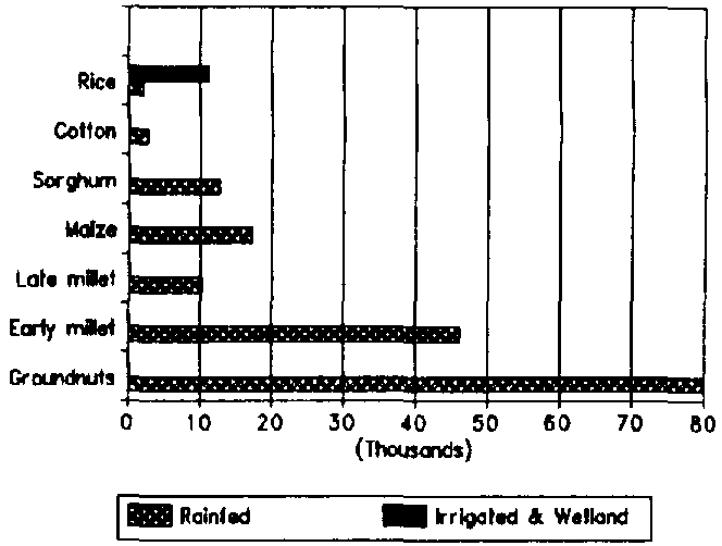 The area harvested annually is about 180 000 ha, or some 40% of the country's cultivable land. The major crops grown are groundnut, millet, sorghum, maize and rice. Minor crops include cotton and vegetables (Figure 2). Nearly all of it is rainfed. Only about 1500 ha is under pump irrigation, although rice is also grown on some additional 10 000 to 15 000 ha of mangrove swamps and freshwater swamps (Figure 3). In the mangrove area, rice is grown from August to January by constructing simple protection dikes.