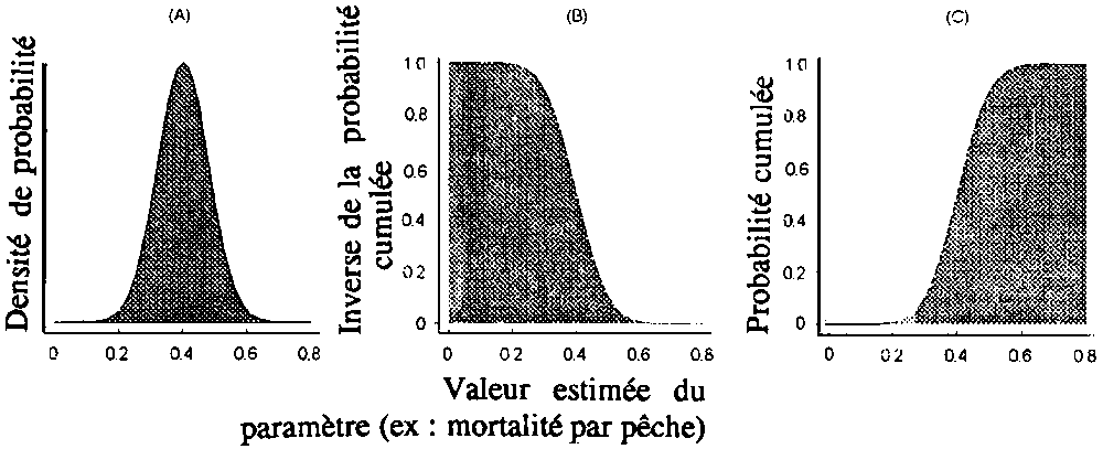 L'information relative à la variabilité des paramètres d'entrée des modèles a été utilisée pour estimer le risque de deux manières. En premier lieu pour simuler la réponse de la population à diverses stratégies d'exploitation, avec pour but de comparer les approches d'aménagement à long terme (Ruppert et al., 1985). En second lieu pour estimer la probabilité d'atteindre ou de s'approcher d'un point cible pour une année donnée, et à partir de là, la probabilité de dépasser une limite ou un seuil indésirables (Mohn, 1993). C'est principalement ce dernier usage qui retient actuellement l'attention en aménagement des pêcheries.