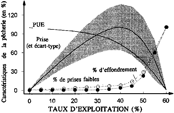 Figure 13: Résumé des caractéristiques d'une pêcherie, d'après une simulation stock-recrutement pour les poissons volants des Caraïbes orientales, où est indiqué le risque d'événements indésirables associé à des niveaux croissants d'exploitation. Ceci inclut la variabilité au niveau des captures et, par inférence, les taux de capture ainsi que la probabilité d'années à "prise excessivement faible" (définie comme une prise annuelle < 30 % de la prise courante moyenne) et "d'effondrement" (défini comme une prise excessivement faible durant quatre années consécutives ou plus) (Mahon, 1989).