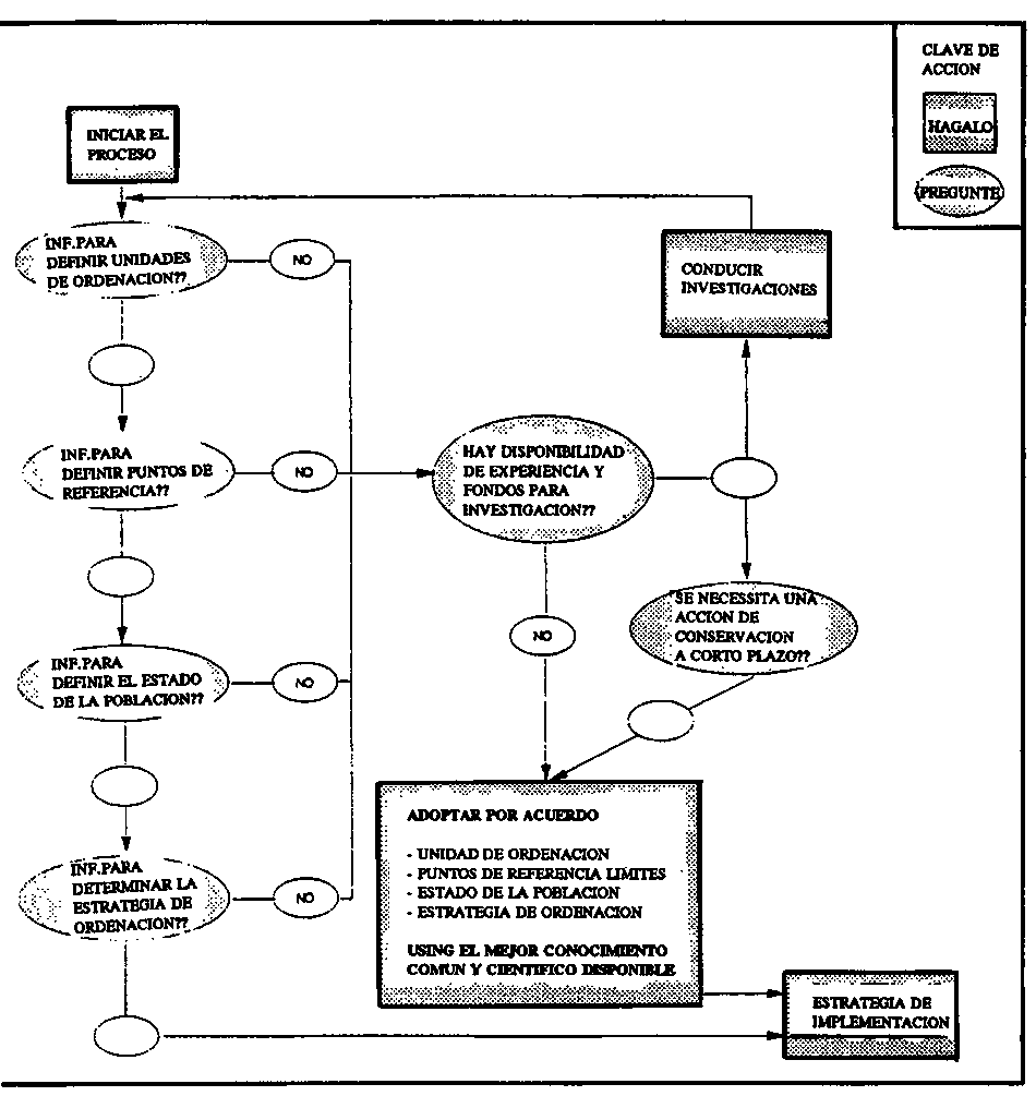 Independientemente de que secuencia de acción se considere como la más apropiada para la pesquería en cuestión, el proceso debería ser documentado de tal manera que facilite las informaciones y la revisión por todas las partes interesadas. Las macro-decisiones también debieran ser tratadas dentro de un marco, como se muestra en la Figura 15, el cual requiere que las decisiones de ordenación se tomen por acuerdo, incluso cuando haya una necesidad de adquirir más información para una ordenación a largo plazo.