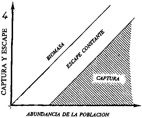 Figura 16: Se muestra una relación idealizada entre la captura y el escape bajo variaciones amplias en la abundancia de la población para cuatro estrategias de ordenación:
