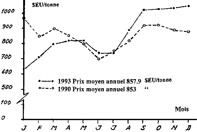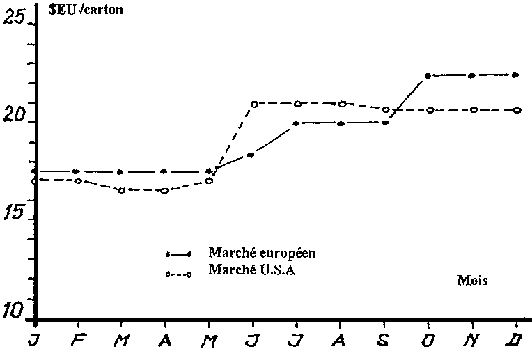 La Figure 4.1 présente un exemple d'un tel type de fluctuation des prix de vente. Il porte sur le prix de vente du thon en boîtes au naturel (48 × 6 ½ oz) importé de Thaïlande aux USA et en Europe au cours de l'année 1993 et montre des variations allant jusqu'à 25,75 et 28,58 % respectivement.