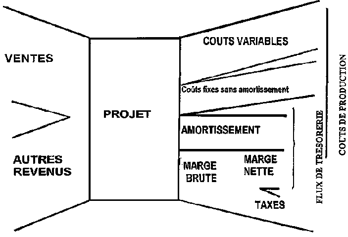 La Figure 4.2 présente deux flux: le premier représente les revenus des ventes, services et toute autre source de revenu de l'entreprise; le second comprend les dépenses et tous les coûts fixes et variables. La marge brute est la différence entre les revenus et les dépenses. L'importance relative des flux dépend du type d'opération concernée.