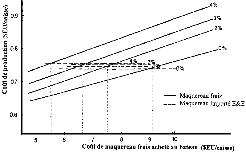 Dans cet exemple, il est clair que plus les taux d'intérêt seront élevés, plus les pêcheurs locaux devront appliquer des prix bas ($EU/carton) pour être compétitifs par rapport à la matière première importée.