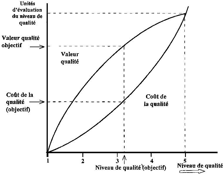Le niveau de qualité sera choisi en recherchant la maximalisation du résultat et en tenant compte du type de produit concerné (par exemple sur la Figure 8.1, un niveau de qualité situé entre 3 et 4). Ce niveau de qualité répondra à l'objectif recherché, qui est de répondre à l'attente du consommateur (suivant des accords contractuels ou implicites). A la suite de cette phase, les objectifs de qualité ainsi que leurs coûts doivent ultérieurement être réévalués après le démarrage de la production.