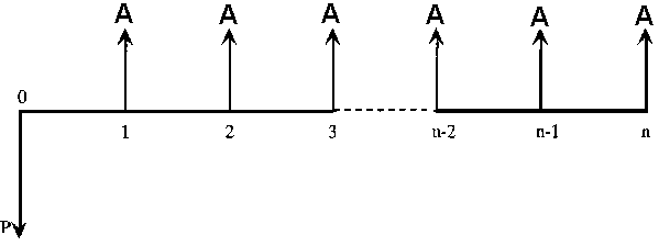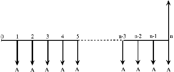 4. A est un paiement unique dans une série de paiements égaux effectués à la fin de chaque période considérée. Lorsque P et A se produisent ensemble, le premier A de la série est produit une période après P. Lorsque F et A se produisent ensemble, le dernier A de la série se produit en même temps que F. Si la série de paiements égaux intervient au début de chaque période considérée, elle est appelée Ab.