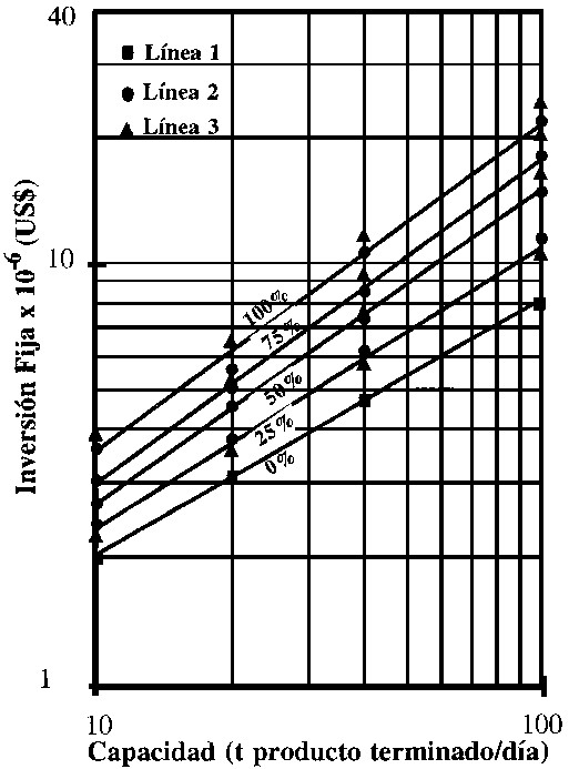 d) Debe observarse que el intervalo válido de capacidades para la aplicación del factor costo-capacidad es de 8-35 t/día. Sin embargo, esta estimación puede ser usada para obtener un orden de magnitud de la inversión requerida.