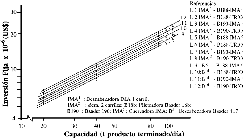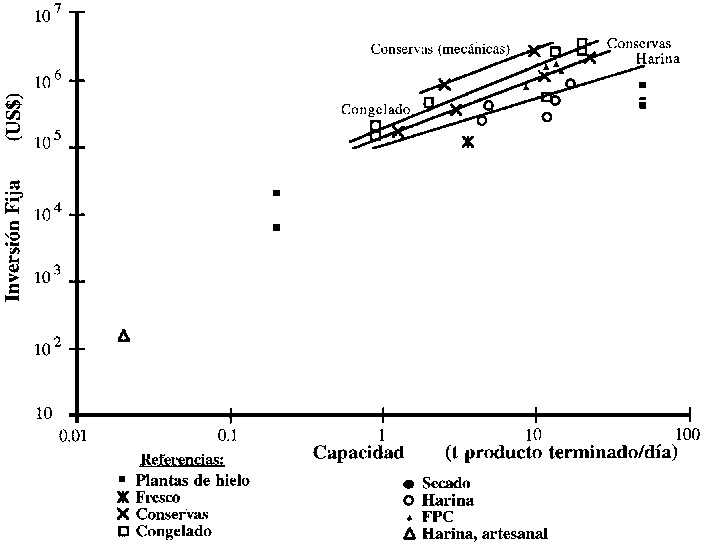 El propósito de los ejemplos 3.1 y 3.2 es explicar y dar los procedimientos prácticos para los cálculos de la inversión de capital. Los métodos descriptos pueden ser aplicados a diferentes tecnologías tanto para plantas integrales de productos congelados, de conservas y de harina de pescado como para plantas individuales, localizadas en zonas industrializadas, o de diferentes tamaños como plantas piloto o de gran capacidad, siempre que el lector siga, entienda y use la información adecuadamente. Las indicaciones sobre el precio, para los equipos y materiales, son sólo estimaciones y la mejor fuente de información será la suministrada por un proveedor con las condiciones de trabajo requeridas. El lector debe adaptar la metodología a su problema particular. Los datos de costos varían con el tiempo, el tamaño del equipo, la ubicación de la planta, el diseño del fabricante, los materiales de construcción, el proceso involucrado y otros factores.